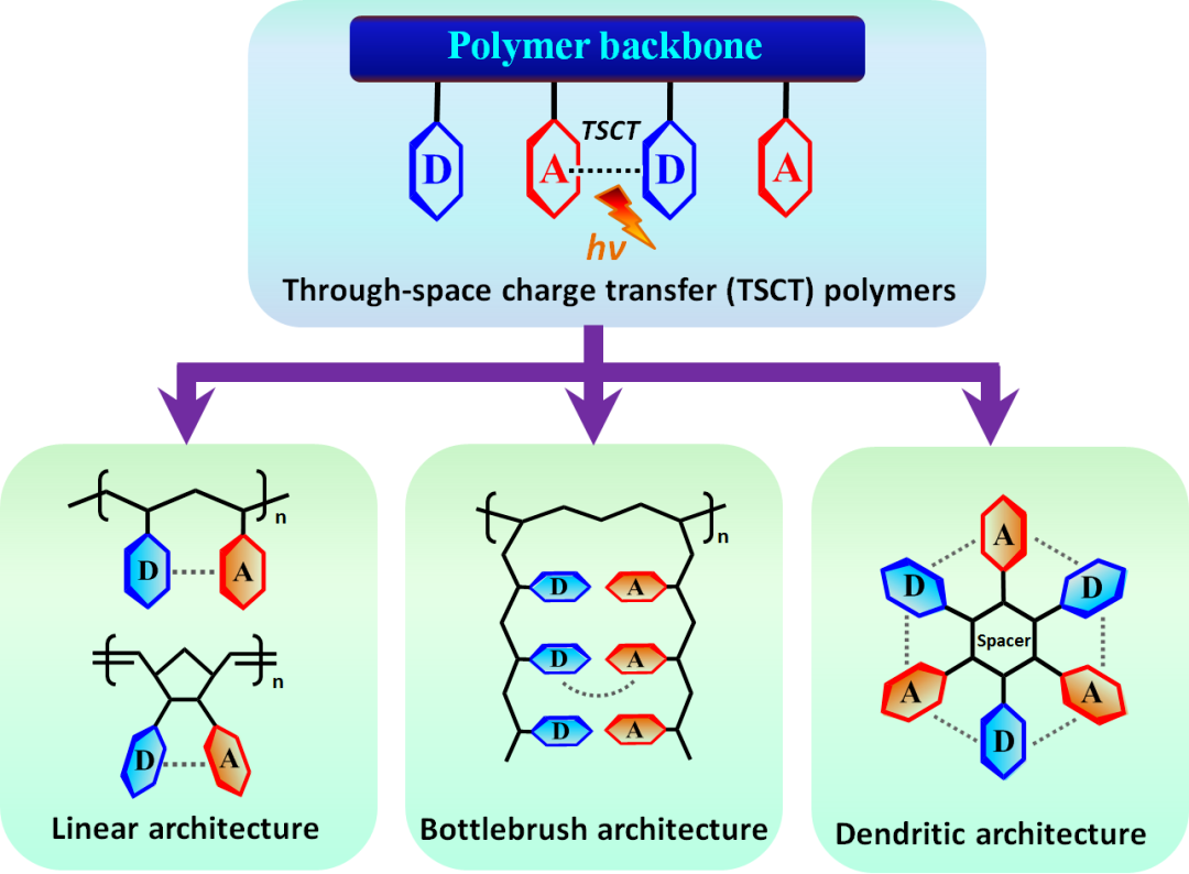 图1. 空间电荷转移高分子荧光材料及其三种拓扑结构