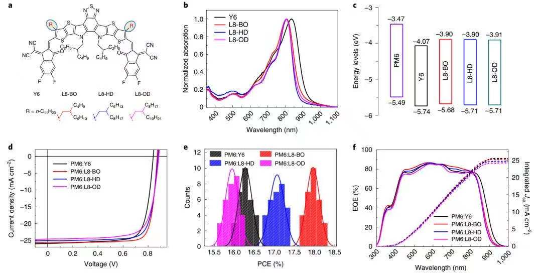 图1. L8-R和Y6化学结构、光物理特性以及光伏器件性能比较图。