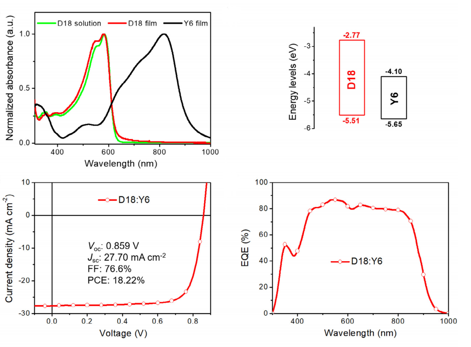 D18的高空穴迁移率为1.59×10-3 cm2 V-1 s-1,对空穴和电子迁移率的平衡更有利;D18: Y6太阳能电池的 PCE 为18.22% 。这项工作展示了 基于DTBT的 共聚物给体在有机太阳能电池方面的巨大潜力。D18有宽带隙为1.98 eV,在三元太阳能电池和叠层太阳能电池中也将有着广阔的应用前景。